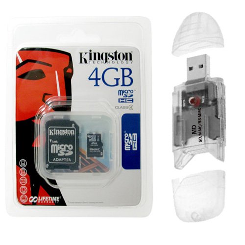 - Includes: Kingston 4GB microSDHC Class 4 Memory Card, SD Adapter and Malcom Distributors Black USB Memory Card Reader